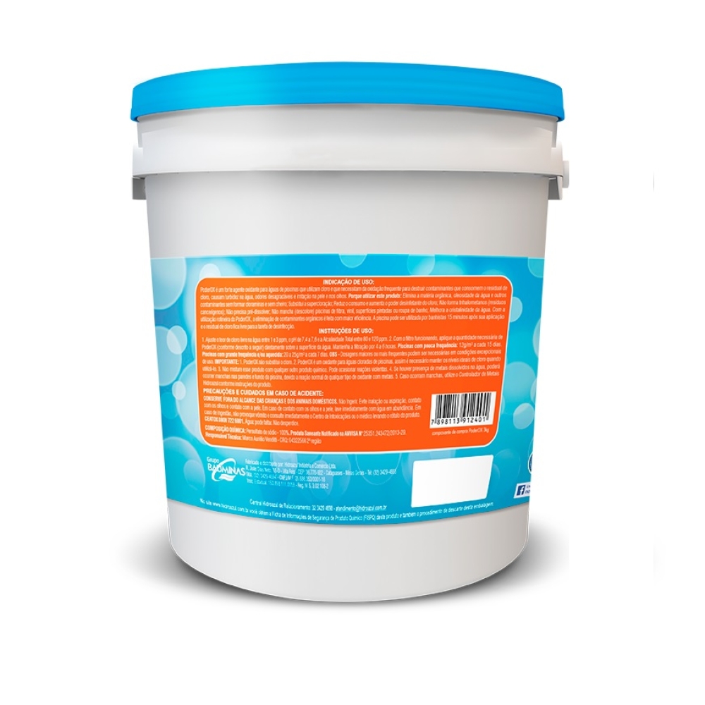 Poderox não substitui o cloro, é um oxidante somente para águas cloradas de piscinas, assim é necessário manter o cloro entre 1e 3 ppm quando utilizá-lo; Se houver presença de metais dissolvidos na água, poderão ocorrer manchas nas paredes e fundo de piscina, devido a reação normal de qualquer tipo de oxidantes com metais.