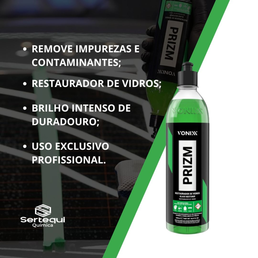 Prizm restaura a transparência em vidros automotivos e remove marcas de água incrustada, impurezas e contaminantes que não saem com a limpeza convencional. O produto age quimicamente contra as manchas e sujeiras, removendo-as facilmente de para-brisas, vidros laterais e traseiros.