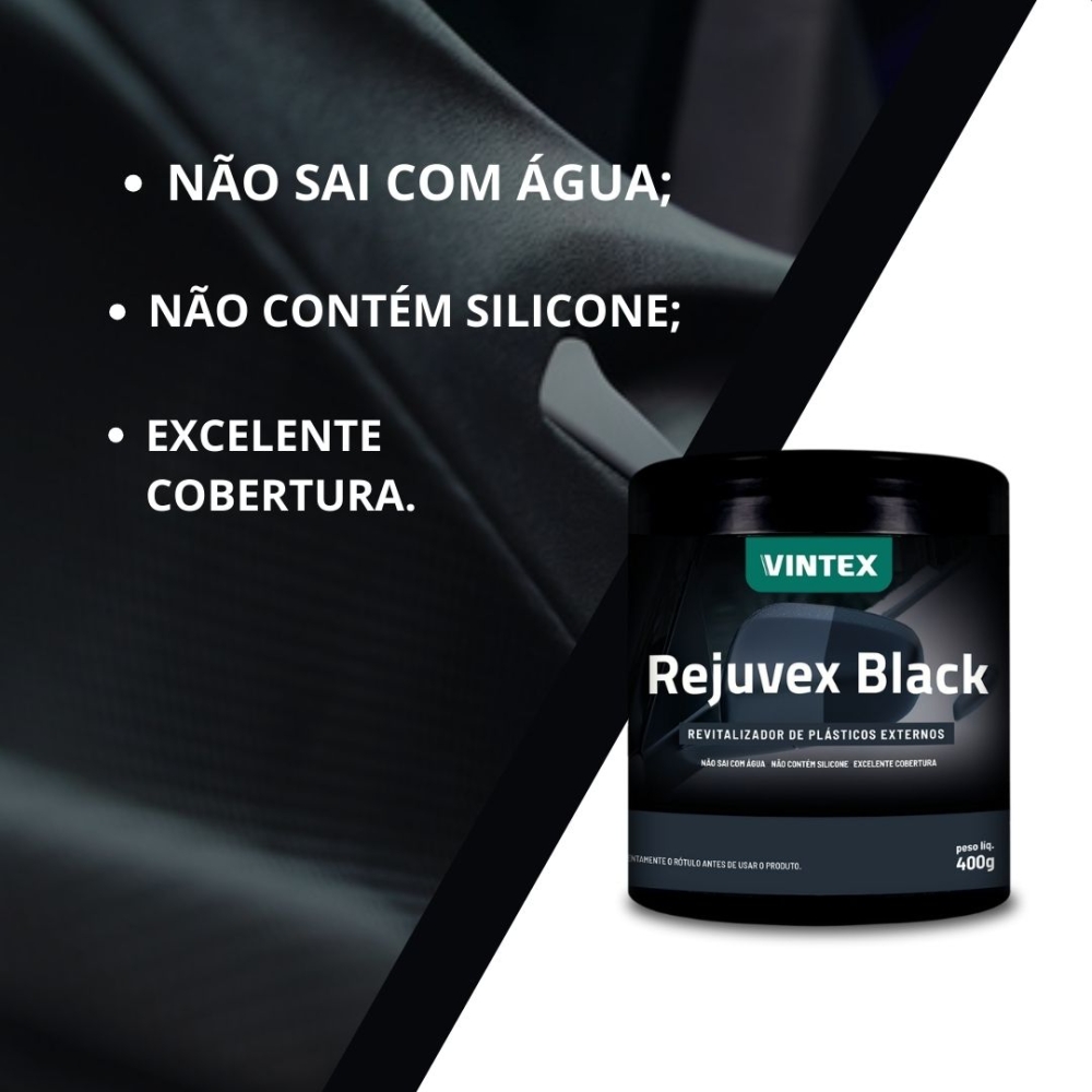 Rejuvex Black é um revitalizador de plásticos que renova e dá brilho em plásticos externos de automóveis. Desenvolvido com matérias-primas especiais, o produto é indicado para uso em oficinas de repintura automotiva, principalmente para os plásticos originalmente mais escuros.