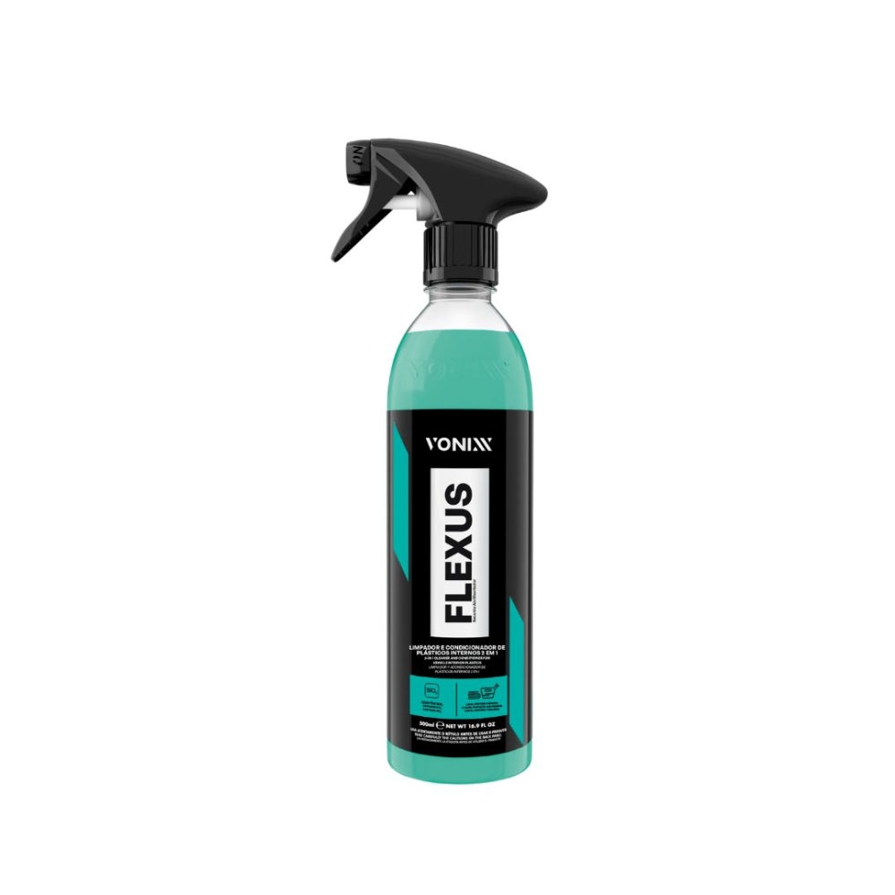 Flexus é um limpador e condicionador de plásticos internos 2 em 1 que limpa e protege ao mesmo tempo. O produto contém SiO2 em sua composição para melhorar a durabilidade e não deixar a superfície pegajosa. Promove acabamento seco ao toque, deixando a peça limpa, com aspecto original e protegida por até 3 meses.